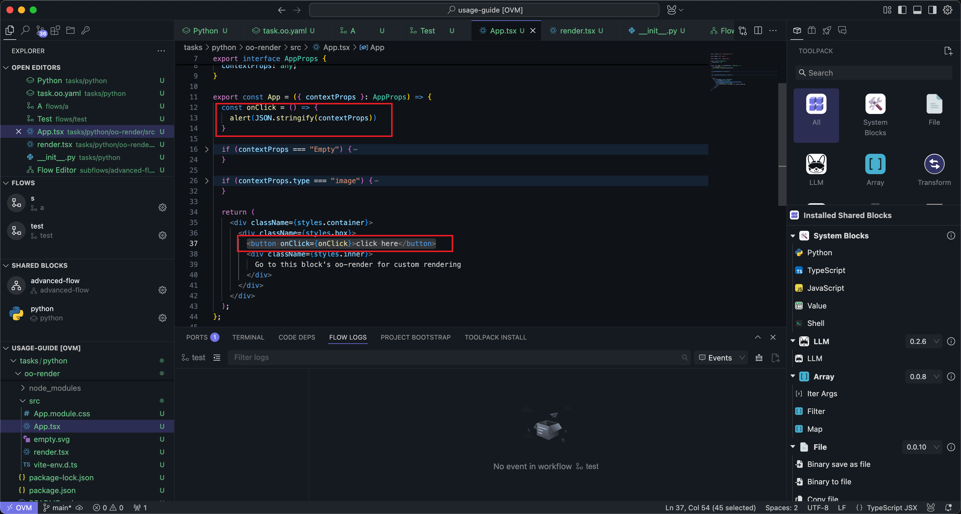 Then we can edit the code in oo-render/src/App.tsx. Here we replace the code that directly prints data with a button that will show an alert with the data when clicked: