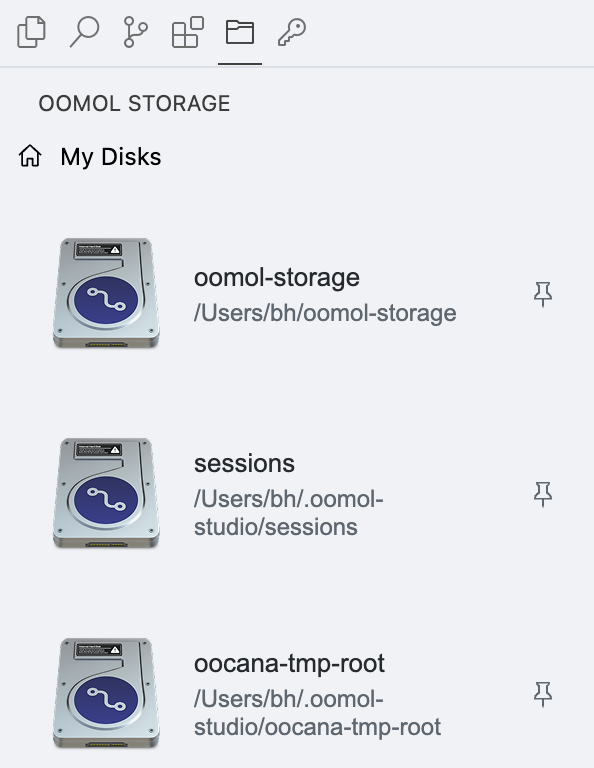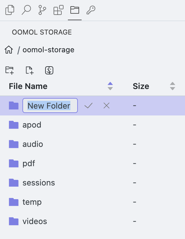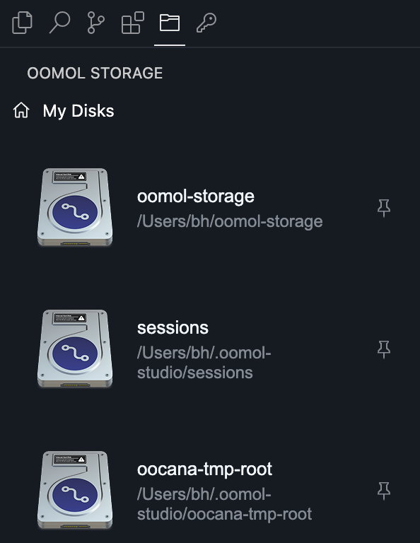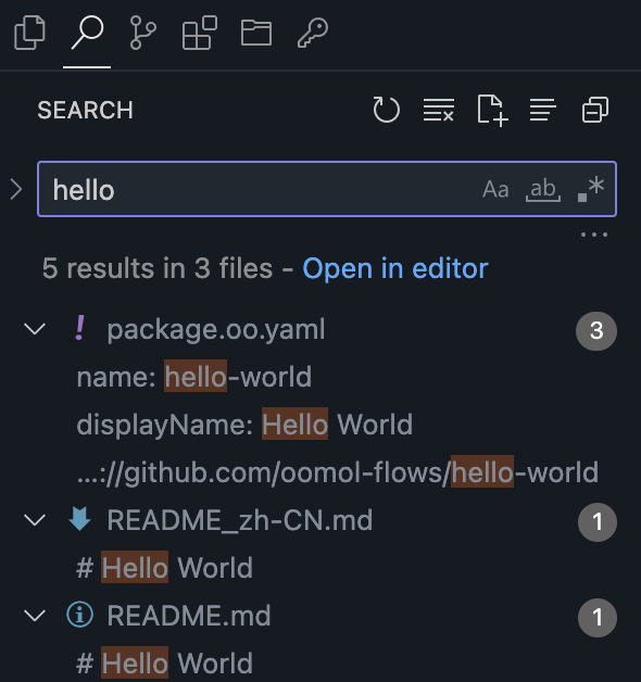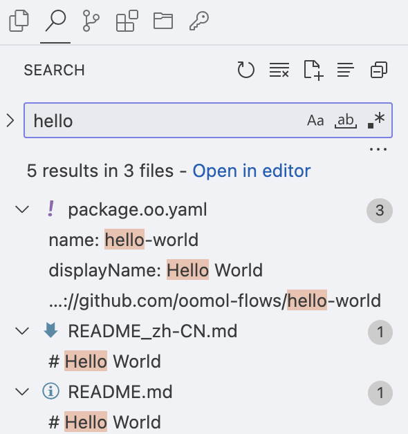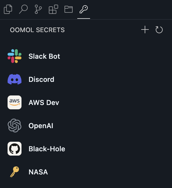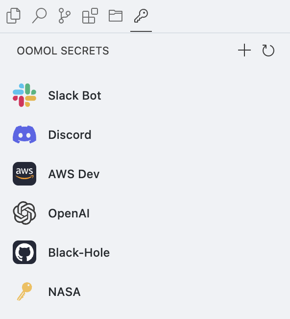 In the left sidebar, OOMOL Studio will show "Explorer" by default. You can also switch to other subviews as needed, such as: Search, Source Control (git), Extensions, OOMOL Storage, OOMOL Secrets.