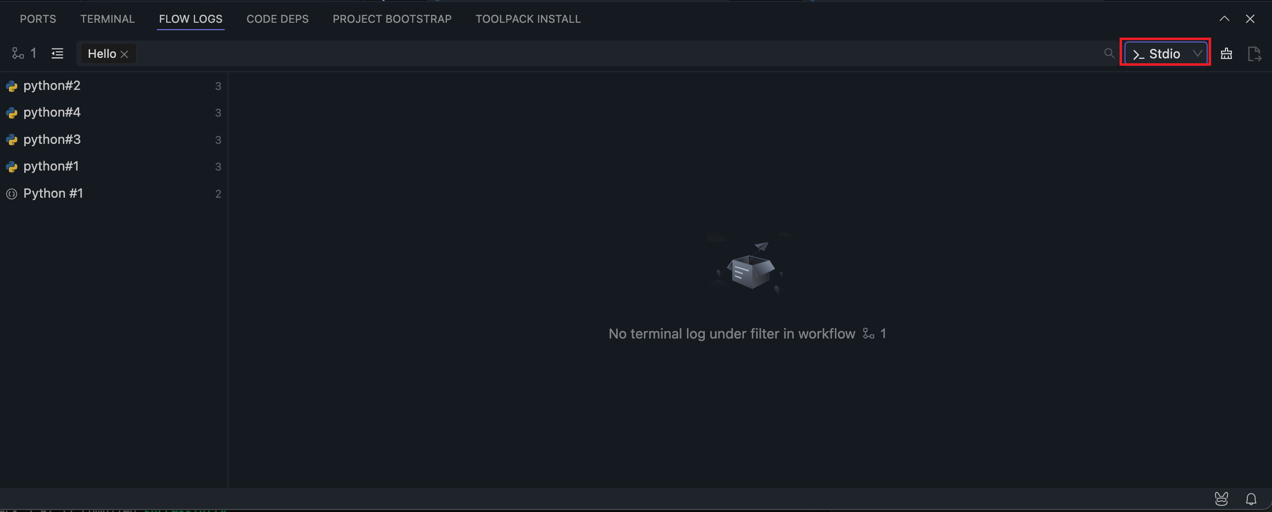 Switch the menu next to the search bar to Studio to display uncaptured logs inside OOMOL Studio.