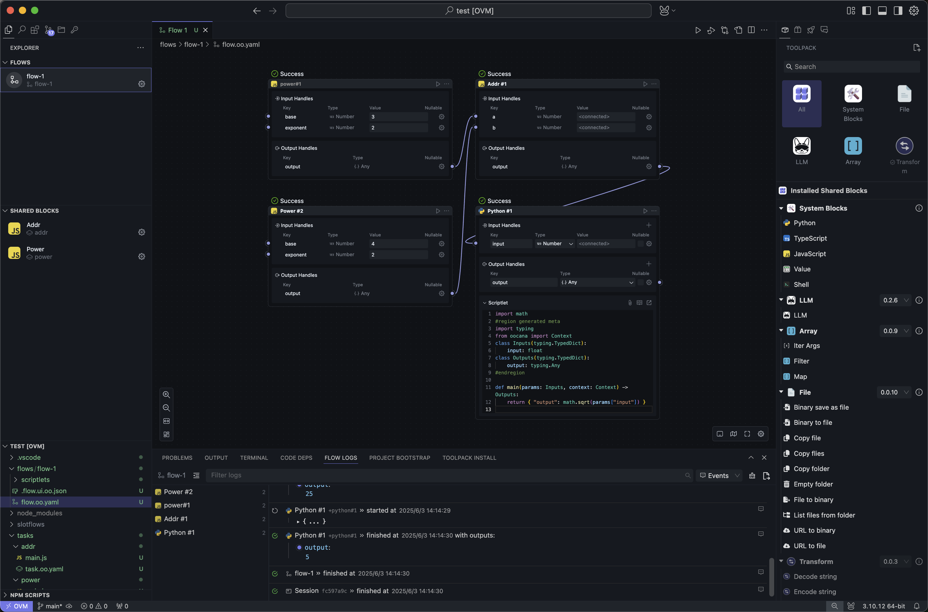 You can see that multiple blocks are combined together in the Flow, forming a complete Flow to calculate the length of the hypotenuse of a right triangle. Each task block can run and be tested independently. They can be reused in other Flows and can also be combined across different programming languages.