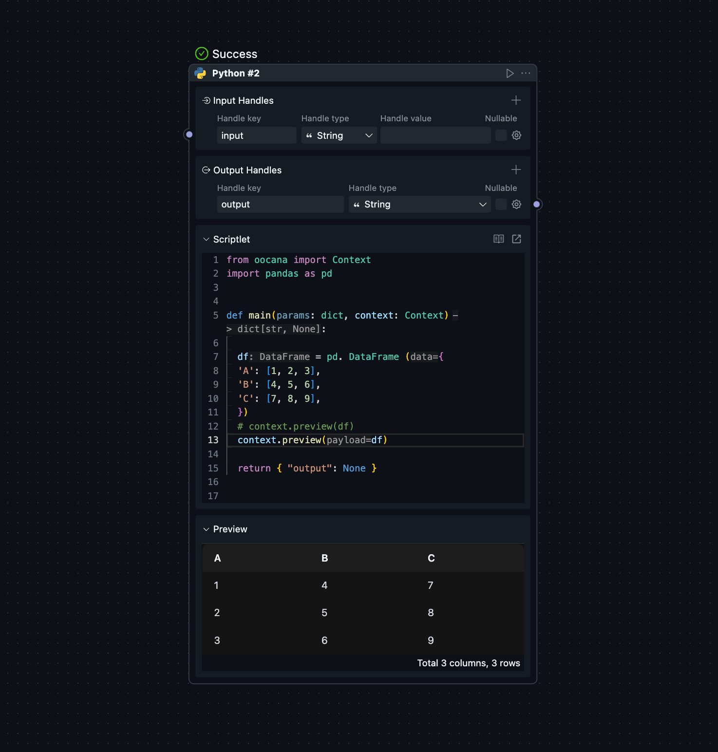 Below is the template function for a Scriptlet. You need to write your execution code within the function body. The input and output types can be customized, and third-party libraries are supported. To pass data to subsequent blocks, simply return a dictionary as you would in a normal function. OOCANA will use the top-level keys as the corresponding output handles, and the values as the output for those handles.